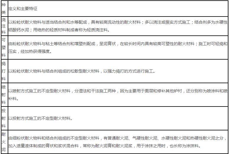 不定型耐火材料的種類很多,可以按照材質(zhì)分類,也可以按照所用結(jié)合劑品種分類。按其工藝特點(diǎn)可分為澆注耐火材料(簡稱澆注料)、搗打式耐火材料(簡稱搗打料)、噴射式耐火材料(簡稱噴涂料)和耐火泥。廣義上耐火涂料也認(rèn)為是一種不定型耐火材料。