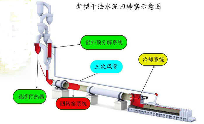 新型干法水泥回轉(zhuǎn)窯分為懸浮預(yù)熱器、窯外預(yù)分解系統(tǒng)、回轉(zhuǎn)窯系統(tǒng)、三次風(fēng)管、冷卻系統(tǒng)等幾部分組成。